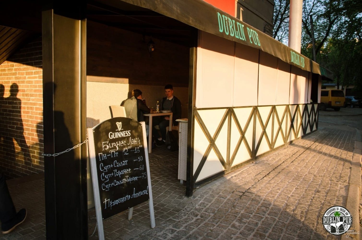Ирландский поэт Брендан Биэн уже в 9 лет стал ИМ. Ответьте, какие 9 букв мы пропустили в тексте вопроса? Ответ: алкоголИкоМ. (Вместо эпиграфа) Стоял промозглый март 2013 года. Стая товарищей, шествуя с интеллектуальных забав по пр-ту Ленина в сторону станции метро Научная, оживлённо вела беседу, куда бы умостить свои тела и как следует подзаправить оные пивом и пищей. И тут один из нас вспоминает, что совсем недавно открылось заведение "Dublin", позиционирующее себя как паб. Предложение отправиться на разведку было поддержано единогласно, и вот мы уже переступаем порог. Сразу же бросается в глаза интерьер паба - кирпичные стены, добротные деревянные столы и скамьи тёмно-коричневого цвета, футбольная символика и весёлые таблички типа "Drunk people crossing" на стенах, украшенный пивными подставками потолок - пока всё намного превосходит ожидания! Да, непосредственно при входе в заведение срабатывает звоночек, поэтому ваш визит будет услышан, даже если вы не будете проходить в главный зал и/или барной стойке, а останетесь в малом зале. На входе в зал вас встречают улыбчивые официанты и официантки, одетые по фирменному дресс-коду. Меню не заставляет себя долго ждать (верее, вообще ждать). Приносят 2 штуки - бар и непосредственно еда. Для любителей коктейлей имеется коктейльная карта. Открыв первую страницу, начинаю всё больше забывать, что я нахожусь в центре первой столицы Украины - потрясающий выбор пива! 10-12 сортов. Немецкое, чешское, голландское и, разумеется, Его Величество Гиннес. К слову, в данном заведении бармен Иван наливает данный напиток правильно - в 2 захода, -а не цедит жиденькой струйкой, будто бы из крана 5-го этажа коммунальной квартиры. Любители выпить чего покрепче также будут не в обиде, выбор водок-ромов-коньяков и прочих текил на уровне. Меню "покушать" зело солидное: здесь вам и снеки-хрустики под пивко, и соления под "беленькую", и супчики-соляночки, и колбаски-салатики, и стейки-корейки, и, конечно же, "тяжёлая артиллерия" для весёлых компаний.. Всё очень вкусно и сытно. Для бОльшего вхождения в атмосферу можно одеть шапку "а-ля леприкон". Время ожидания заказа вам поможет скоротать кроссворд или поединок в морской бой, распечатанные на листах-подставках "под тарелки", а также классический рок, тихо-мирно играющий в колонках. Во время футбола музыка выключается и включается звук телека. Коктейльная карта невелика, но содержит большинство самых ходовых позиций. Как показала практика, в выходные, а также в дни интересных футбольных матчей, в заведении свободных мест нет - дабы не рисковать стОит забронировать столик заранее. Периодически случаются акции, обычно приуроченные к значимым событиям пивного мира - как то день рождения сэра Артура Гиннеса, День святого Патрика и т.д., а по воскресеньям скидка на всё меню -20%! Летом работает внешняя площадка. но там можно курить, в то время как в самом пабе используется "бэст практис ол овэ зээ вёрлд" и внутри курить нельзя, за что отдельные висты! Также не запрещается играть в настольные неазартные игры. За более чем два года заведение абсолютно не "зажралось", а наоборот мотает на ус все пожелания клиентов (например, изначально почему-то отсутствовали зубочистки на столах - хи-хи, неправда ли?!), пиво не киснет, мясо не тухнет, "довольни хамы..." ой, это не отсюда =) "Итоги падведьом" (С): чертовски замечательное